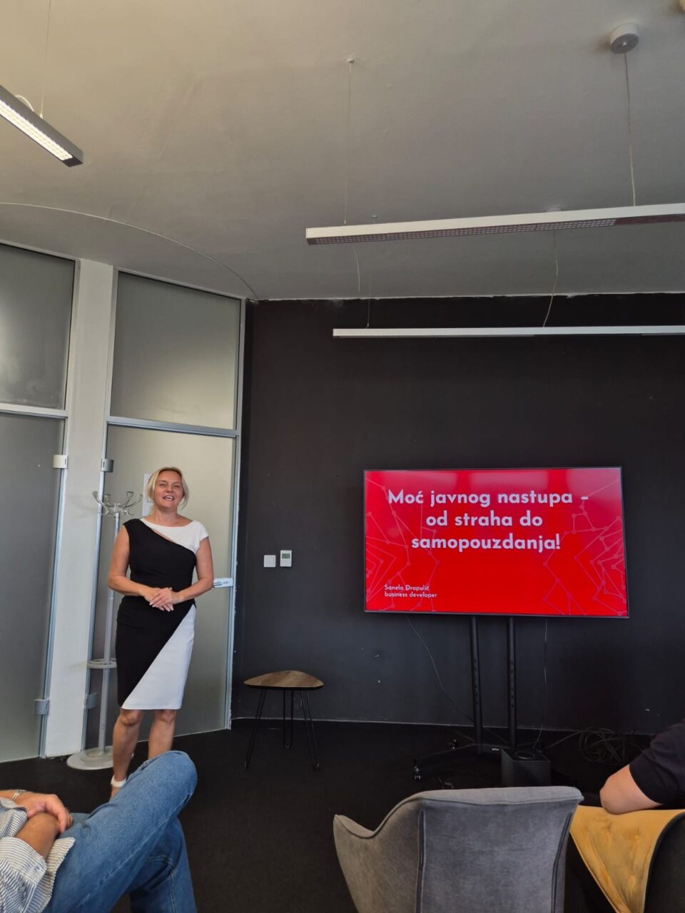 Tema predavanja bila je „Moć javnog nastupa – od straha do samopouzdanja“, a vodila ga je Sanela Dropulić, idejna pokretačica inicijative Mladi i poduzetni i iskusni business developer.
