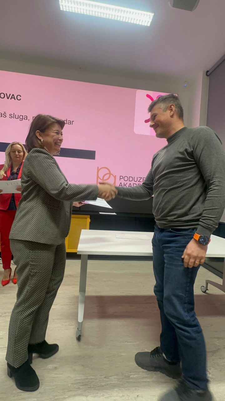 Certifikate su im uručili Domagoj Ilečić, direktor Poduzetničkog Inkubatora Velika Gorica i pročelnik Ureda za gospodarstvo Velike Gorice, Kristina Ukalović, idejna začetnica Poduzetničke akademije i vlasnica Učilišta Adrianus, te Dominik Ladišić, predsjednik inicijative Mladi i poduzetni