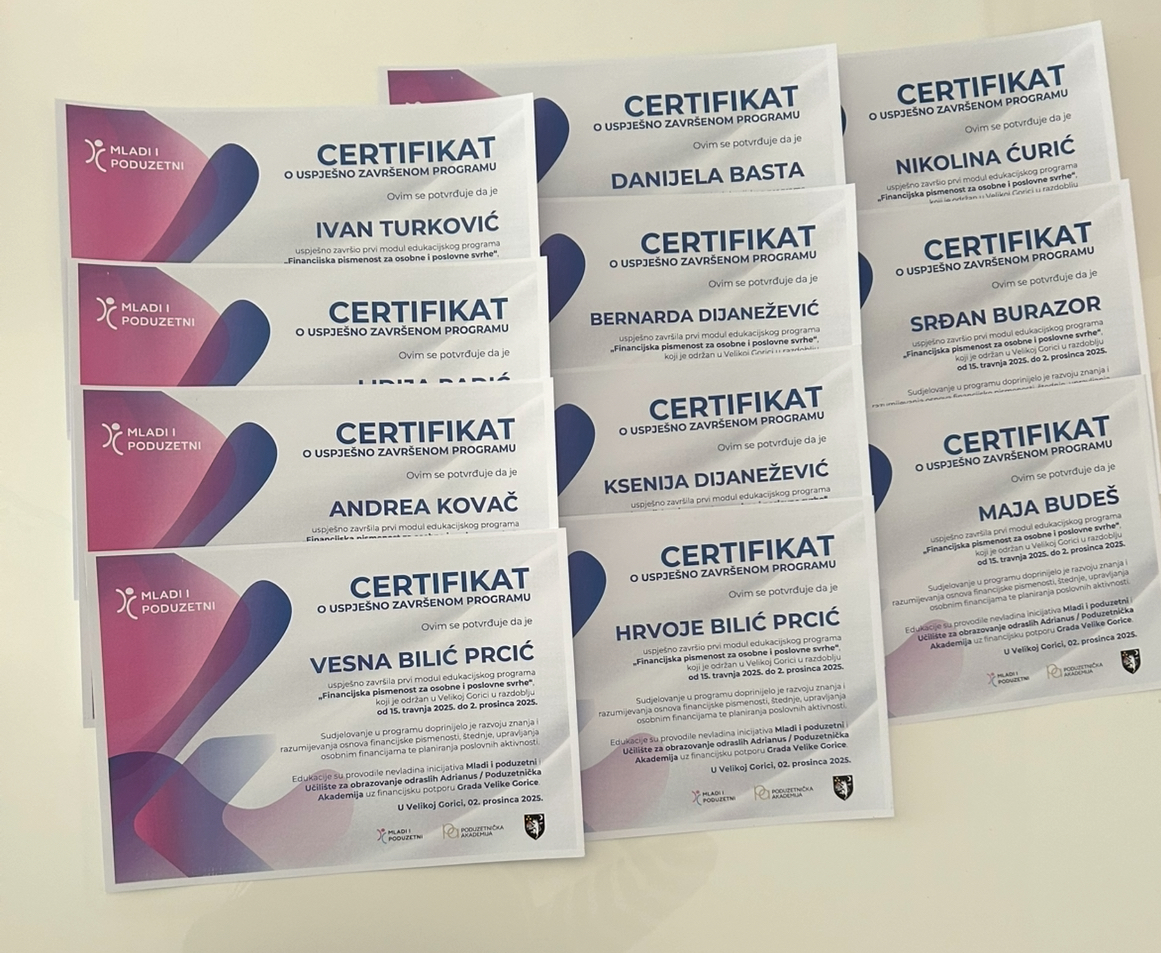 Certifikate su im uručili Domagoj Ilečić, direktor Poduzetničkog Inkubatora Velika Gorica i pročelnik Ureda za gospodarstvo Velike Gorice, Kristina Ukalović, idejna začetnica Poduzetničke akademije i vlasnica Učilišta Adrianus, te Dominik Ladišić, predsjednik inicijative Mladi i poduzetni